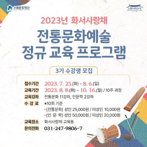 [제주교통복지신문 김강석 기자] 수원문화재단은 이달 25일부터 8월 6일까지 ‘2023년 화서사랑채 전통문화예술 정규 교육 프로그램 3기’ 수강생을 선착순 모집한다.