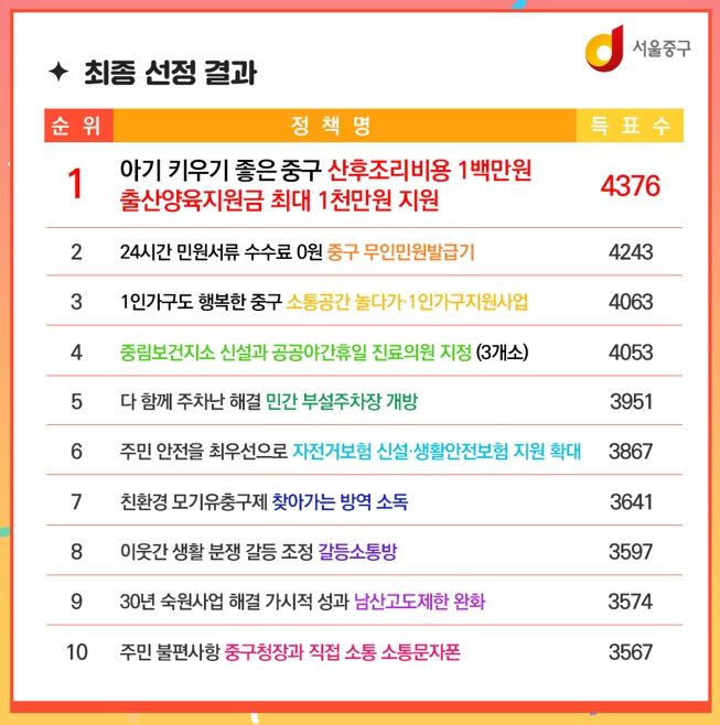 주민들이 가장 큰 지지를 보낸 정책은 4,376표를 얻은 ‘아이키우기 좋은 중구 산후조리비용 1백만원, 출산 양육지원금 최대 1천만원 지원’이다. 저출생이 국가 위기로 이어지는 현실을 직시하고 과감하게 추진한 구의 대책이 구민의 마음을 움직였다는 평가다.