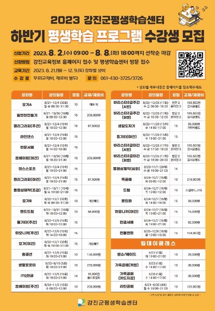 8월 2일부터 8일까지 선착순으로 모집하며, 강진군 교육정보 홈페이지 또는 강진군 평생학습센터를 직접 방문해 신청하면 된다. 강의는 8월 21일부터 순차적으로 개강해 12월 초까지 진행된다.