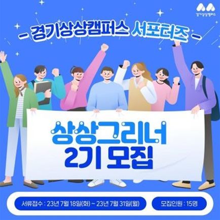 모집인원은 총 15명으로, 경기도에 거주하거나 생활하여 상상캠퍼스에 관심을 가지고 있는 19세 이상이면서 개인 소셜 미디어 1개 이상 운영자(블로그 필수), 상상캠퍼스 오프라인 행사 참여 가능자라면 누구나 지원할 수 있다. ‘상상그리너(상상Greener)’라는 명칭에는 ‘상상캠퍼스의 풍경을 그리고, 푸르게 만드는 사람들’이라는 의미를 담았다. 모집 기간은 7월 18일부터 7월 31일까지이며 경기상상캠퍼스 누리집' 상상그리너 모집 공고에서 온라인 폼을 작성하여 접수할 수 있다.