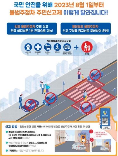 인도 불법주정차 주민신고제 운영 시간은 주말 및 공휴일에 관계없이 24시간 운영되며, 보도와 차도가 명확히 구분된 구간에 대해 과태료를 부과한다. 변경 사항은 원활한 제도 정착을 위해 7월 한 달 계도기간을 거쳐 8월 1일부터 시행할 예정이다.