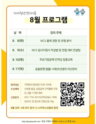 교육시간은 오전 10시 ~ 오후 1시까지로 강의당 15명 내외의 청년들을 선착순으로 모집하며 거제청년센터 이룸으로 전화 또는 방문하거나 링크주소 및 QR코드를 통해 신청 가능하다.