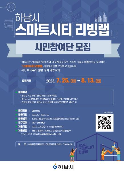 [제주교통복지신문 김강석 기자] 하남시는 오는 8월 13일까지 ‘스마트시티 리빙랩’ 시민참여단 25명을 모집한다고 25일 밝혔다.