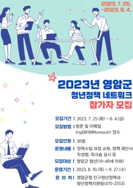 청년정책 네트워크에 참여할 청년은 영암군 홈페이지 ‘고시공고’란을 참고해 서류를 작성한 다음, 방문하거나 이메일로 접수할 수 있다.