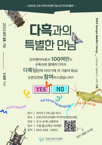 오는 28일 13시, 군포시미디어센터 미디어상영관에서 청소년들의 유망 직업인 유튜버 ‘다흑’을 초청해 특별 강연을 연다.