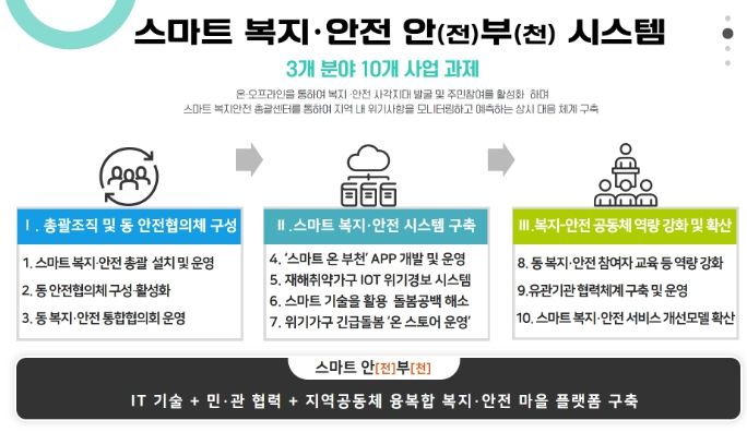 이에 부천시는 ▲복지·안전 총괄 조직 강화 ▲‘스마트 온 부천’ 어플리케이션을 통한 온라인 마을공동체 플랫폼 운영 ▲동 안전협의체 구성 및 활성화 등 정보통신(IT) 기술을 활용한 ‘스마트 복지·안전 안(전)부(천) 시스템 구축’이라는 주민참여 모델로 사업의 우수성을 인정받아 공모 대상자로 선정됐다.