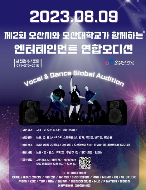 [제주교통복지신문 김강석 기자] 오산시와 오산대학교가 공동주최하고, 오산대학교 보컬KPOP콘텐츠과와 오산중앙청소년문화의집이 공동주관하는 '제2회 오산시와 오산대학교가 함께하는 엔터테인먼트 연합오디션'이 8월 9일 오후 2시 오산대학교 지성1관 퍼포먼스룸에서 개최된다.