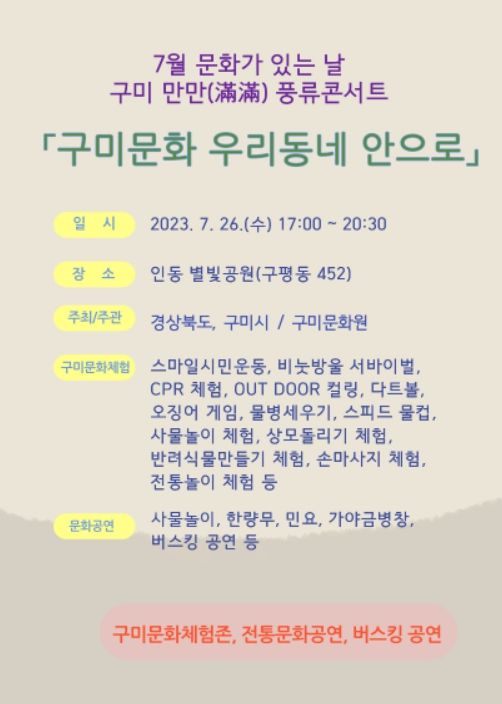 [제주교통복지신문 김강석 기자] 구미시는 26일 별빛공원(구평동 소재)에서 구미문화원 주관으로 7월 문화가 있는 날 '구미 만만(滿滿) 풍류 콘서트 - 구미문화 우리 동네 안으로'를 개최한다.