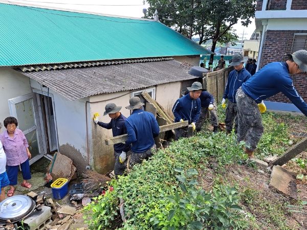 김제시에 따르면 지난 집중호우로 주택 담장이 무너져 발생한 피해에 대하여 주민의 안전을 위해 무너진 담장 철거와 배수로를 105여단 윤승규 3대대장 이하 장병들이 정비하고 있다