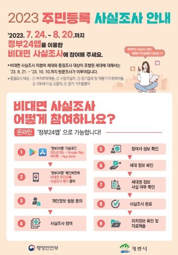 주민등록 사실조사는 주민등록지와 실거주지 일치 여부를 확인하는 조사로, 7월 24일부터 8월 20일까지 ‘비대면-디지털 조사’를 진행한 이후, 8월 21일부터 10월 10일까지 이·통장 및 공무원이 거주지에 방문하여 확인하는 방식으로 진행한다.