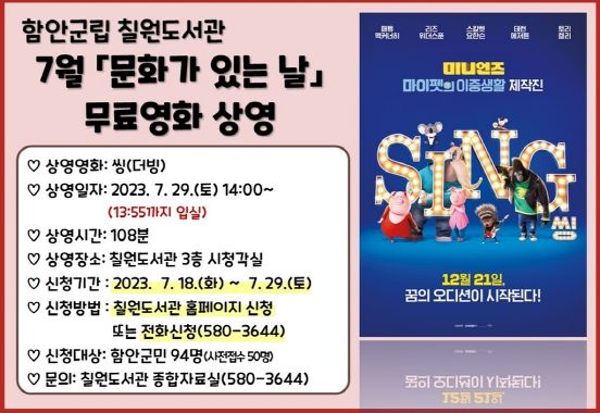 [제주교통복지신문 김강석 기자] 함안군립 칠원도서관은 오는 29일 토요일 오후 2시, 3층 시청각실에서 애니메이션 영화 ‘씽’을 무료로 상영한다.
