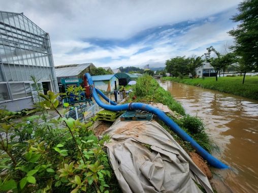 지난 24일 새벽부터 내린 190여㎜의 집중호우로 인해 함평엑스포공원 다육식물관, 친환경농업관 등 전시관이 일부 침수되자 군은 곧바로 이동형 대형양수기를 현장에 투입했다.