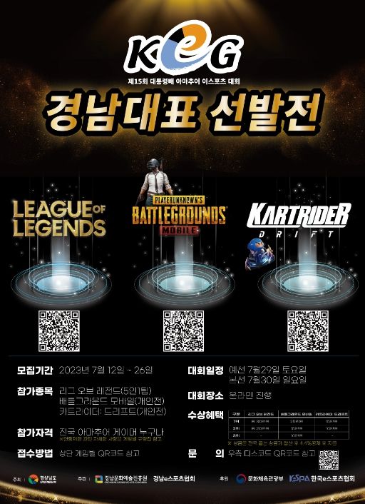 게임산업 저변을 확대하고 청소년들의 건전한 게임문화 조성을 위해 개최되는 이번 대회는 리그오브레전드(5인 단체전), 배틀그라운드(개인전), 카트라이더 드리프트(개인전) 등 3개 종목으로 진행된다. 온라인을 통해 29일 예선과 30일 본선을 치를 예정이다. 결승전은 경남문화예술진흥원, 경남이스포츠협회 유튜브로 송출된다.