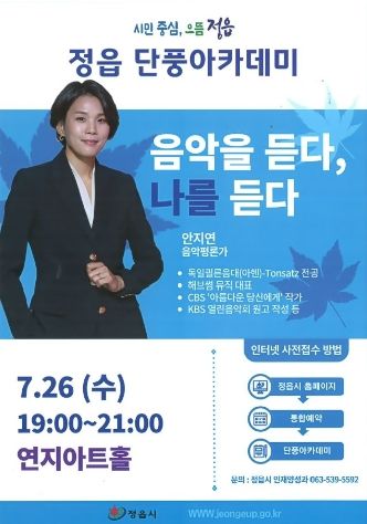 [제주교통복지신문 김강석 기자] 정읍시는 26일 오후 7시 연지아트홀에서 음악평론가 안지연 강사를 초청해 ‘음악을 듣다, 나를 듣다’라는 주제로 제106회 정읍 단풍아카데미를 개최한다.