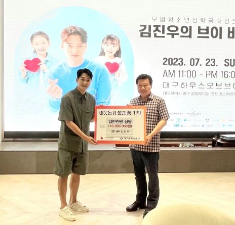 [제주교통복지신문 김강석 기자] 배우로 종횡무진 활약 중인 김진우가 7월 23일 브이스퀘어 1층(대구 중구 공평로10길 18, 하우스오브브이)에서 “배우 김진우와 함께하는 사랑의 브이 바자회”를 개최하고 바자회 수익금 등 후원금 및 후원품 1,000만원을 중구청에 기탁했다.