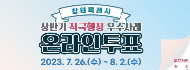 [제주교통복지신문 김강석 기자] 창원특례시는 7월 26일부터 8월 1일까지 2023년 상반기 적극행정 우수사례를 선발하기 위해 창원시청 홈페이지에서 온라인투표를 진행한다고 밝혔다.