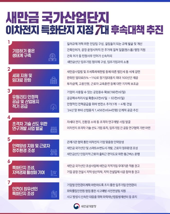 [제주교통복지신문 김강석 기자] 새만금개발청은 새만금 국가산업단지에 이차전지 투자에 최적화된 산업 생태계를 조성해 기업이 바글바글하는 최고의 산업단지로 만들겠다고 밝혔다.