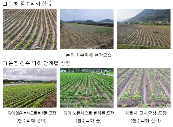 △콩 재파종, 수확량과 품질 떨어질 것 참고= 침수 피해가 심각한 논콩 재배 농가가 재파종 또는 다른 작물을 파종할 경우, 논콩 파종 한계기(7월 20일 전후)가 이미 지난 시점임을 고려해야 한다.
