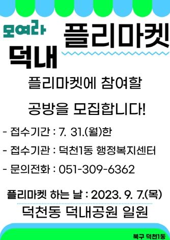 플리마켓에 참여하고 싶은 공방 및 기관은 오는 7월 31일까지 덕천1동 행정복지센터로 신청 가능하며, 공방은 신청 시 간단한 체험 프로그램(만들기 공예, 그림 그리기 등 종류 무관) 1가지를 선정하여 제출하여야 한다.