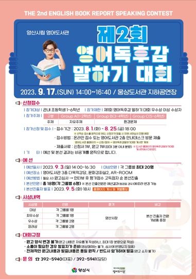 [제주교통복지신문 김강석 기자] 양산시립 영어도서관은 영어 독서 문화의 보급과 활성화를 목표로 오는 8월 1일부터 영어 도서를 읽고 느낀 점을 작성해 자유롭게 발표하는 '제2회 영어독후감 말하기대회'를 개최한다.