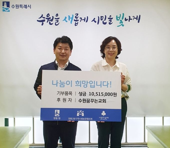 [제주교통복지신문 김강석 기자] 수원시 영통2동 소재 수원꿈꾸는교회는 지난 25일 생활이 어려운 이웃들을 돕기 위해 신도들과 함께 모금한 사랑의 성금 10,515,000원을 영통2동 행정복지센터에 기부했다.