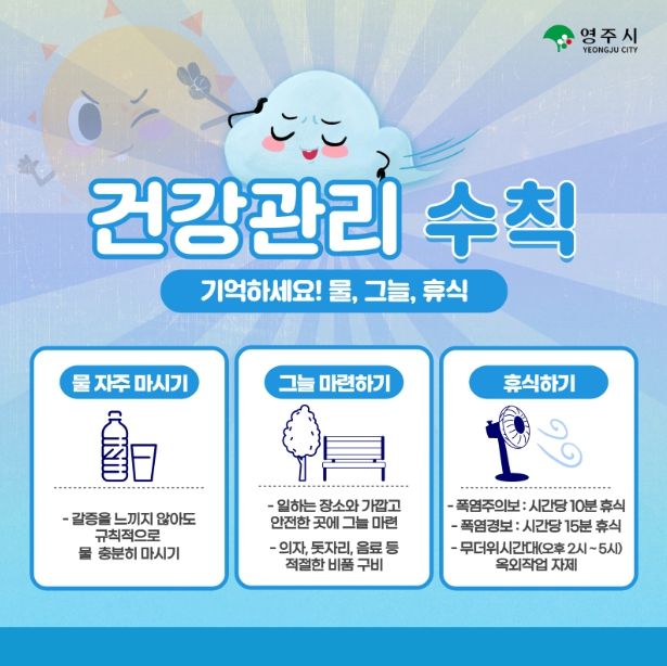 권경희 영주시 보건소장은 “역대급 폭염이 예상되는 올여름, 폭염주의보·경보가 발령되면 가능한 한 위험 시간대(정오~오후 5시) 활동을 줄이고, 폭염 때 행동요령을 생활화해 안전사고가 발생하지 않도록 주의해달라”고 당부했다