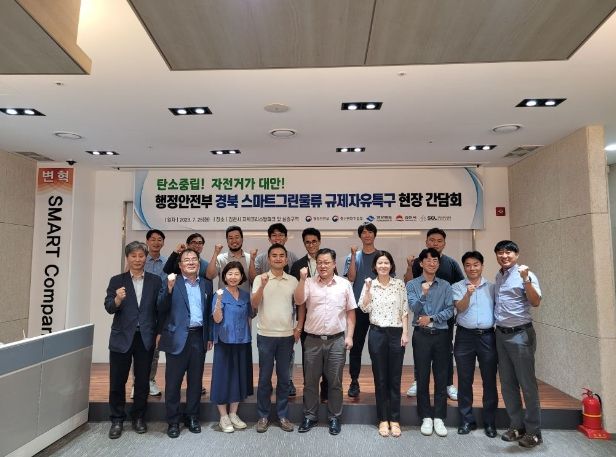 [제주교통복지신문 김강석 기자] 김천시에서는 25일 자전거법을 담당하는 행정안전부 생활공간정책과의 과장 방문으로 스마트 그린물류 규제자유특구 간담회가 개최됐다. 이날 간담회는 행정안전부 신일철 과장, 경상북도·김천시·경북 TP, 그리고 특구 참여 기업 대표 등이 모인 가운데 진행됐다.