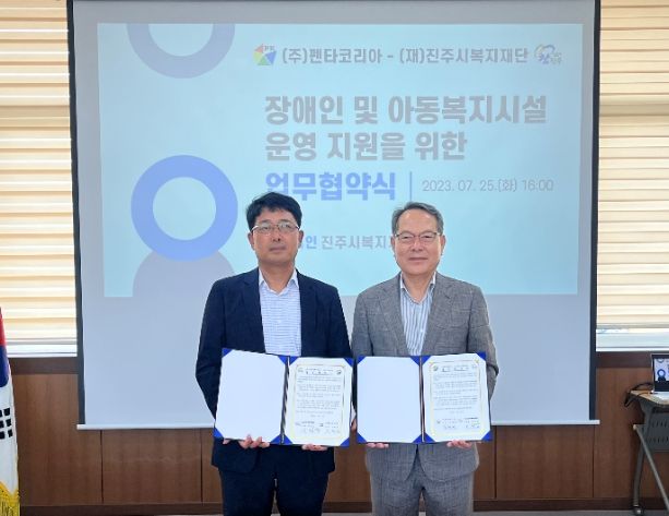 [제주교통복지신문 김강석 기자] ㈜펜타코리아(대표 조원찬)와 (재)진주시복지재단(이사장 이성갑)은 지난 25일 진주시복지재단 회의실에서 관내 취약계층‘장애인 및 아동 복지시설 운영지원’을 위한 업무협약식(MOU)을 가졌다.