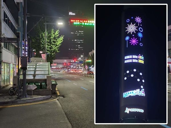 [제주교통복지신문 김강석 기자] 대전 0시 축제가 열리는 중앙로(대전역∼목척교 구간)에 설치된 CCTV에 축제를 홍보하는 곡면형 LED 경관조명이 설치돼 눈길을 끌고 있다.