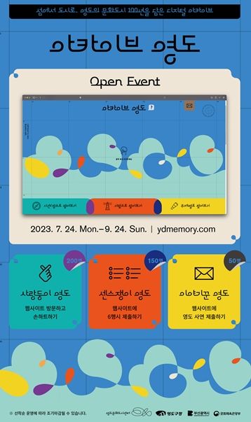 한편 아카이브 사업을 총괄하는 영도문화도시센터는 올해 아카이브 영도 운영 뿐만 아니라 50명의 시민기록자 양성, 500건의 생활자료 수집, 파친코로 보는 영도 문화도시 팸투어 구축 등을 운영 중이며 아카이브 영도 홍보를 위한 오픈 이벤트도 운영 중이다. 자세한 사항은 영도문화도시센터에서 확인할 수 있다.