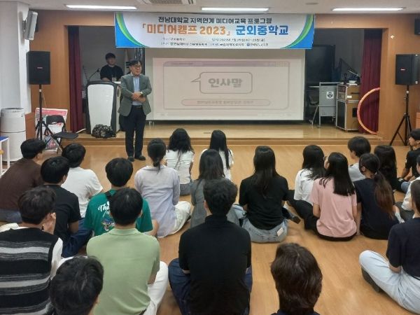 소외 지역 청소년에게 미디어 홍보 역량을 갖춘 미래인재로 성장할 기회를 제공하기 위해 마련된 이번 캠프는 전남대학교 신문방송학과 교수 및 학생이 주관하며, 군외중학교 학생과 전남대 운영진과 교직원 등 40여 명이 참여했다.