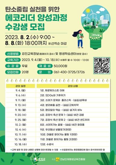 [제주교통복지신문 김강석 기자] 강진군 평생학습센터는 전남형 생태학습도시 조성을 위해 8월 2일부터 ‘에코리더 양성과정’ 수강생 20명을 선착순 모집한다.