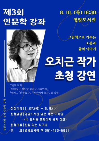 [제주교통복지신문 김강석 기자] 영암군이 8월 10일 영암도서관에 오치근 그림책 작가를 초청해 ‘제3회 정기 인문학 강좌’를 개최한다.