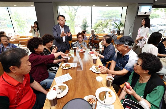 동구빵 판매점인 앤드아워(수문통로27)는 어르신들에게 홍국쌀크랜베리크림치즈빵과 강화쑥앙버터빵 등 동구빵 2종과 커피, 대추차, 쑥라떼 등 음료 3종을 제공했다.