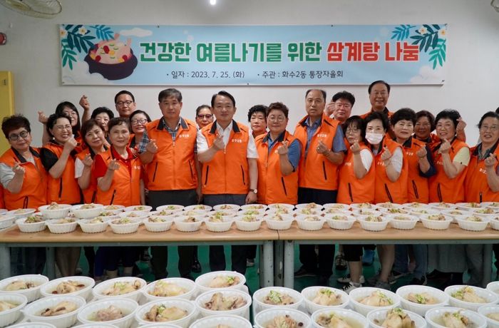김찬진 동구청장은 “무더운 날씨에도 불구하고 따뜻한 마음으로 이웃들을 위해 온정을 베푸는 화수2동 통장자율회의 노고에 감사드린다”며 “어르신들이 삼계탕을 드시고 무더운 여름을 잘 보내셨으면 좋겠다”고 말했다.