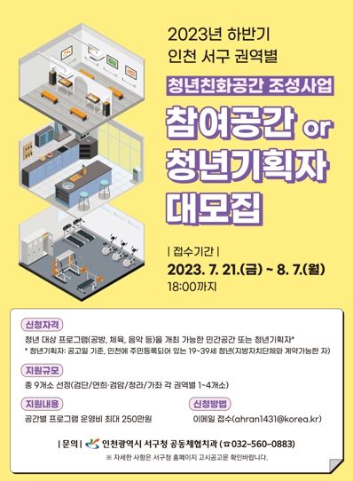 [제주교통복지신문 김강석 기자] 인천 서구가 청년 간 교류를 활성화하고 청년 활동 기반을 마련하기 위해 올해 하반기 ‘청년친화공간 조성사업’의 권역별 참여공간과 청년기획자를 다음 달 7일까지 모집한다고 밝혔다.