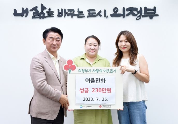 [제주교통복지신문 김강석 기자] 의정부시는 7월 25일 여울민화가 어려운 이웃들을 위해 민화아트페어 수익금 및 여울민화 회원 기부금 230만 원을 기부했다고 밝혔다.