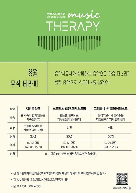[제주교통복지신문 김강석 기자] 의정부음악도서관은 8월 한여름 더위를 겪으며 쌓인 스트레스를 해소하고 전문 치료사에게 심리적 치유를 받을 수 있는 ‘뮤직 테라피’ 프로그램을 운영한다.