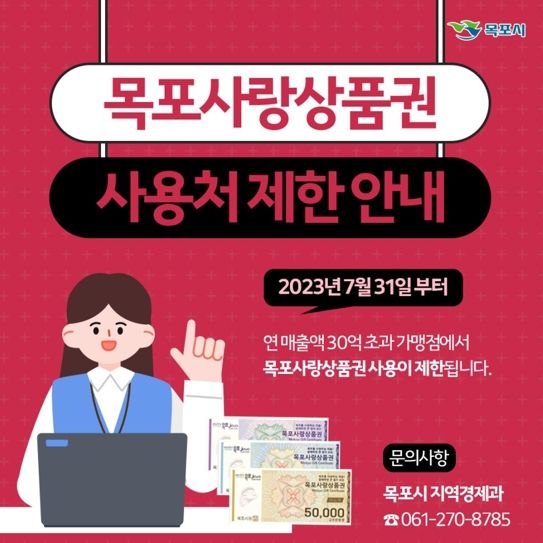 [제주교통복지신문 김강석 기자] 목포시는 지역 자금의 역외유출 방지 및 지역 내 소비촉진을 위해 운영하고 있는 목포사랑 상품권을 연매출 30억원 이하 업체만 사용할 수 있다고 밝혔다.