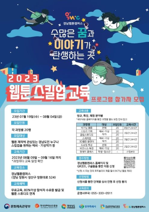 [제주교통복지신문 김강석 기자] 경상남도와 경남웹툰캠퍼스는 지역 웹툰 인재 양성과 역량강화를 위해 ‘2023 경남웹툰캠퍼스 웹툰 스킬업 교육 프로그램’을 실시한다고 밝혔다.