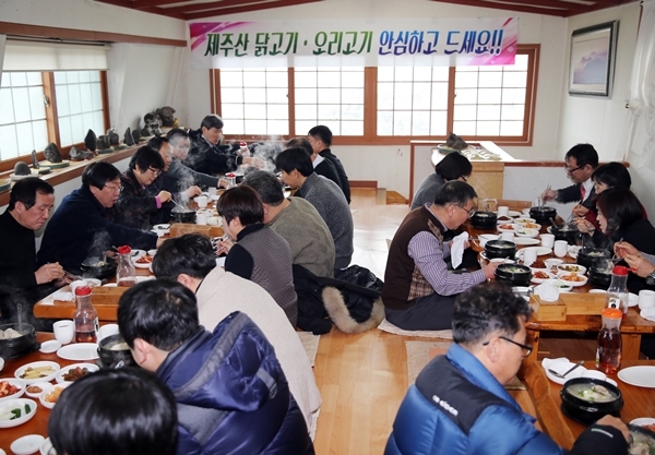 제주시청은 23일, 시내 한 음식점에서 시장 및 임직원, 그리고 출입 기자 등이 참석한 가운데 닭·오리 고기 소비 촉진을 위한 삼계탕 시식회를 진행했다.