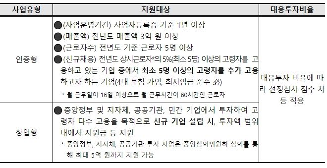 고령자친화기업 신청 유형은 ‘인증형’과 ‘창업형’으로 구분된다. 먼저 ‘인증형’ 유형은 현재 상시근로자의 5%(최소 5명) 이상으로 고령자를 고용한 기업이 일정 규모(최소 5명) 이상의 고령자를 추가로 고용할 때 지정한다. ‘창업형’ 유형은 정부, 공공기관 또는 민간에서 현금이나 현물 등을 투자하여 다수의 고령자를 고용하기 위하여 기업을 신규로 설립할 때 지정한다.
