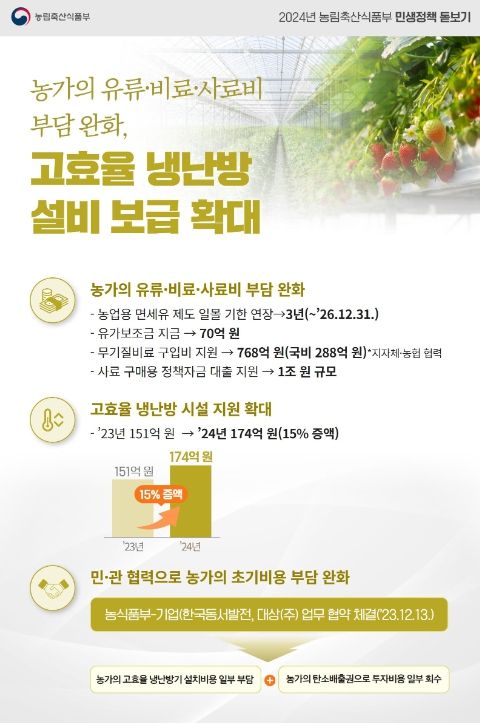 농식품부 관계자는 유류·비료·사료비 지원과 고효율 냉난방 시설 보급 확대로 농가의 경영 안정에 도움이 될 것으로 기대하면서 “경영비 부담을 덜 수 있는 다각적인 정책으로 농업인들께서 안심하고 농사를 지으실 수 있도록 적극 노력하겠다.”라고 밝혔다.