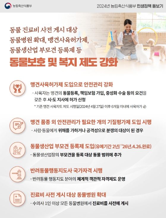 농식품부는 동물 진료비 사전 게시 확대 적용을 차질 없이 추진하는 한편, 맹견 관리, 부모견 등록제, 반려동물행동지도사 자격 등의 내용이 포함된 '동물보호법' 하위법령 일부개정안을 이달 말 입법예고할 계획이다.
