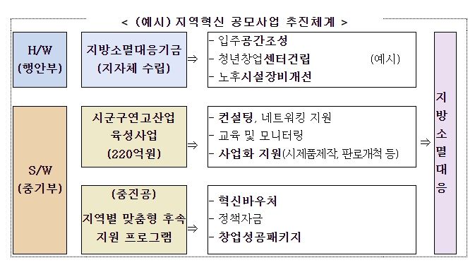 지역혁신 공모사업은 89개 인구감소지역과 18개 관심지역 등 107개 지자체를 대상으로 진행되며, 기초지자체가 주도하여 지방소멸대응 전략을 수립하고, 최종 선정된 과제에 대해서는 지방소멸대응기금(HW사업)과 지역 중소기업 지원사업(SW사업)을 연계하여 지원하게 된다.