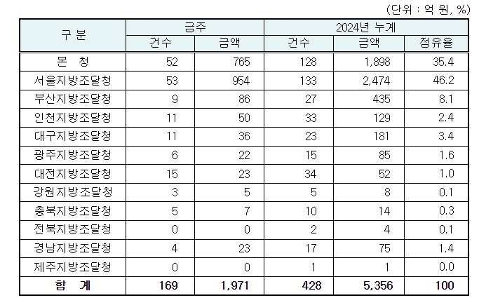 지역별 발주량을 보면 대전광역시 소재 본청 765억 원, 서울지방청 954억 원 등 2개청(1,719억 원)이 전체 금액(1,971억 원)의 87.2%를 차지하고 있으며, 인천 등 나머지 10개 지방청 252억 원이 각각 집행될 예정이다.