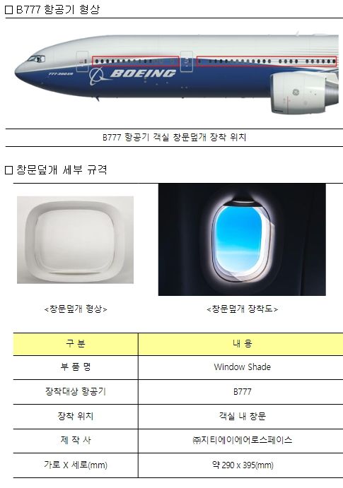 [제주교통복지신문 송한신 기자] 국토교통부는 국내 중소업체인 ㈜지티에이에어로스페이스가 개발한 B777 항공기 객실 창문덮개(Window Shade)에 대해 안전성 인증을 완료(’24.1.12 국토부)하고 국내 항공사에 공급한다고 밝혔다.