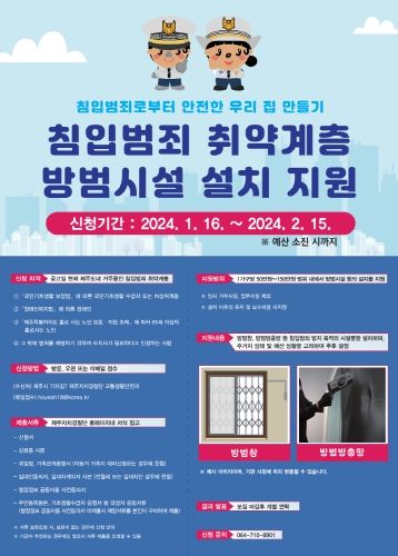 신청기간은 1월 16일부터 2월 15일까지이며, 총 사업비 5,000만 원으로 약 30가구를 지원할 계획이다. 선정된 가구는 50만~150만 원 범위 내에서 방범방충망 등 범죄예방시설을 무상 지원받는다.