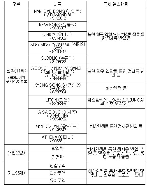 이번에 제재 지정된 박경란은 주단동 백설무역 소속으로 중고선박과 정제유를 북한에 반입하였으며, 민명학은 리상무역 총사장으로 대북 불법 해상환적 활동 및 북한 노동자 송출에 관여해왔다. 만강무역은 백설무역 단동지부와 연계되어 해상환적을 통한 북한산 석탄 등의 밀수출과 중고선박 대북 반입에 관여해왔고, 리상무역은 해상환적을 통한 밀수출과 유류 밀반입에, 유아무역은 해상환적을 통한 북한산 석탄 등의 밀수출에 각각 관여해왔다.