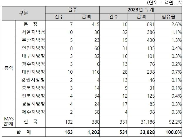 지역별 발주량을 보면, 총액계약 대상 822억 원 중 본청이 415억 원으로 50.5%를 집행하고 서울청 등 11개 지방청에서 407억 원을 각각 집행할 예정이다.